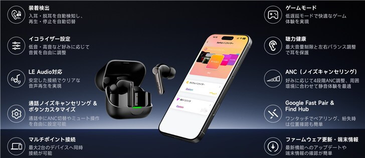 • 全部入りの機能性:マルチポイント、ワイヤレス充電、防水、ゲームモード、装着検出など隙がない。
