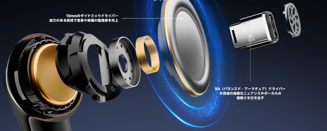 低音が得意なダイナミック型(DD)と、高音が得意なバランスド・アーマチュア型(BA)を両方使うことで、力強い低音クリアな高音 を同時に楽しむことができます。