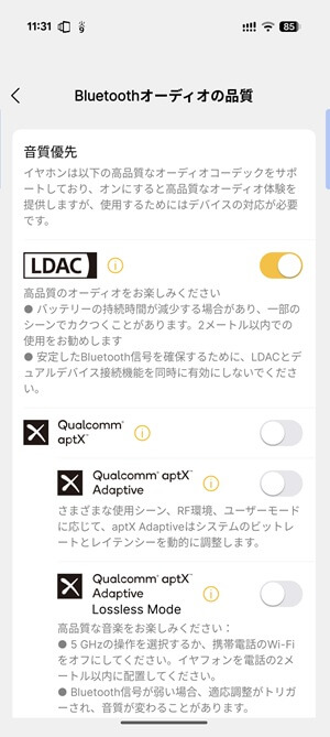 そうそう。本機はほぼ全てのコーデックにも対応しています。LDAC接続aptX Losslessでハイレゾ音源を再生すると、そのポテンシャルがさらに発揮されますよ。音の分離感が良く、立体的な音場を楽しめます。
