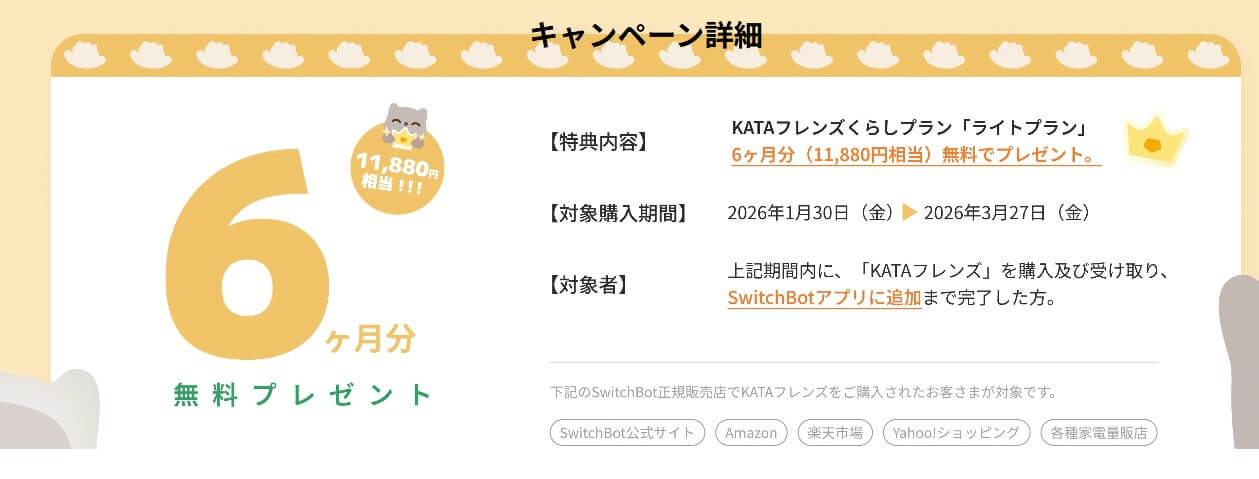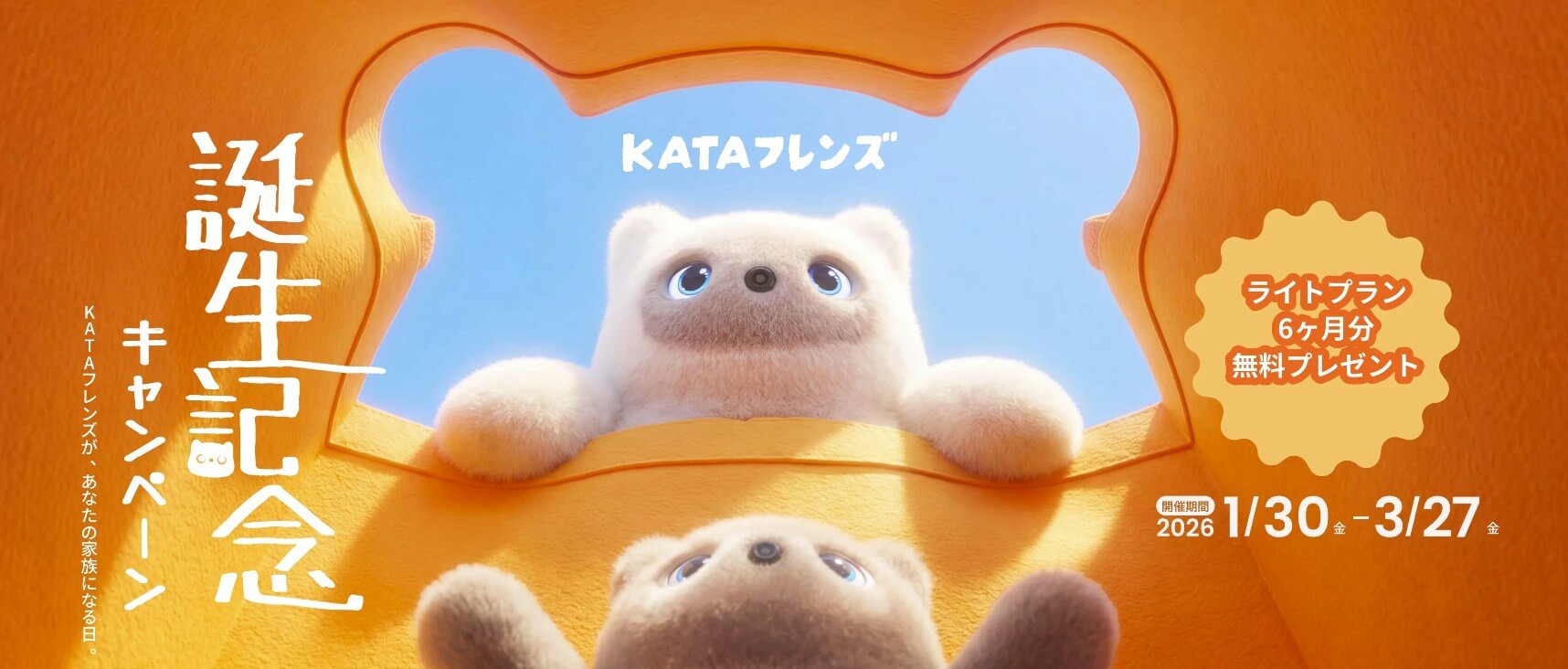 期間中にKATAフレンズをお迎え(購入)した方全員に、KATAフレンズくらしプラン「ライトプラン6ヶ月分(11,880円相当)」が無料でプレゼントされます。